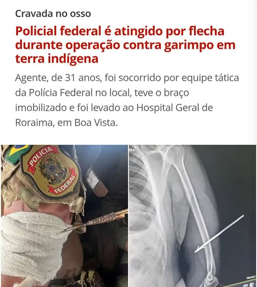 Policial federal é atingido por flecha durante operação contra garimpo em terra indígena de RR. Agente, de 31 anos, foi socorrido por equipe tática da Polícia Federal no local, teve o braço imobilizado e foi levado ao Hospital Geral de Roraima, em Boa Vista.